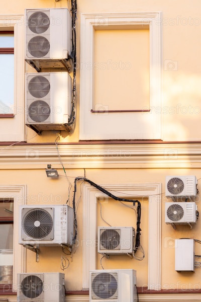 Кондиционеры установлены на стене здания. охлаждение в жаркую погоду