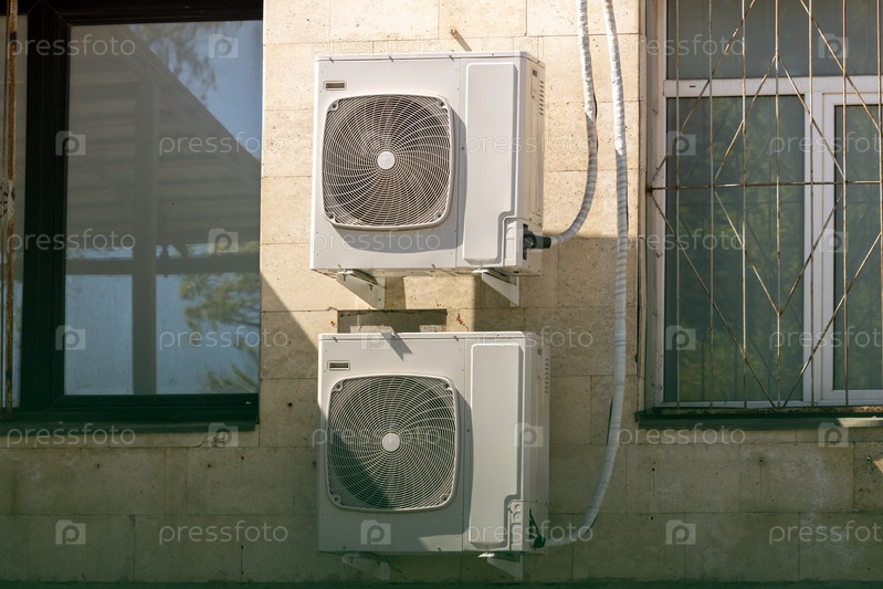 Кондиционеры установлены на стене. технология охлаждения воздуха в жаркую погоду