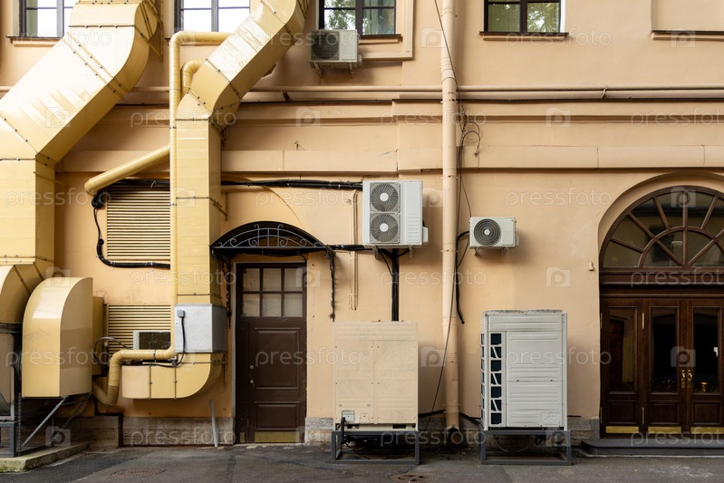 Кондиционер на фасаде желтого исторического дома.Вентиляция и система охлаждения
