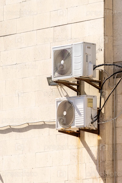 Кондиционеры установлены на стене. технология охлаждения воздуха в жаркую погоду