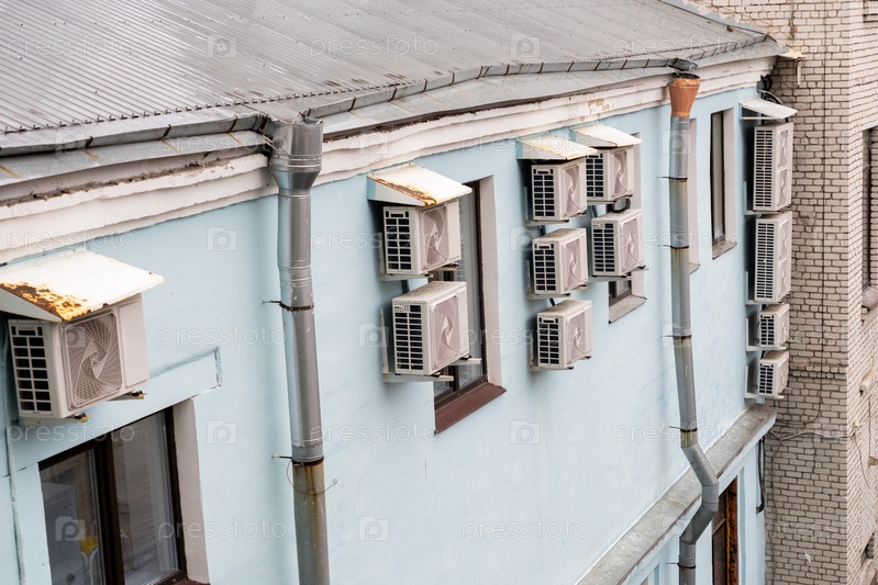 Кондиционеры установлены на стене здания. охлаждение в жаркую погоду