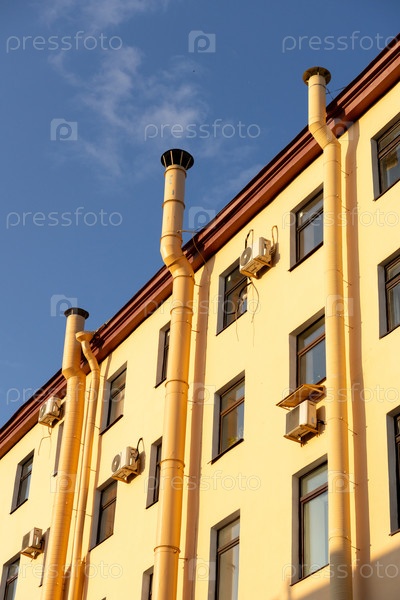 Кондиционер на фасаде желтого дома против синего неба.Вентиляция воздуха