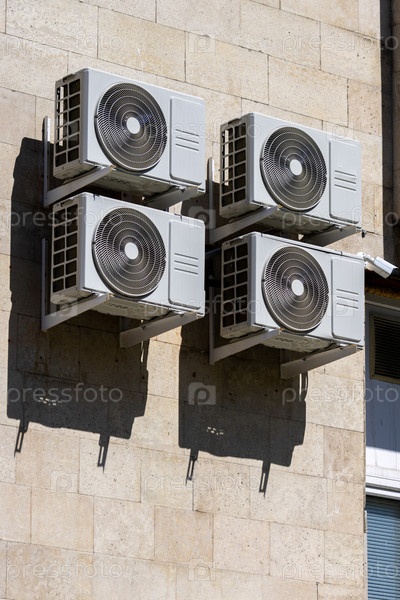 На стене четыре кондиционера.Кондиционеры белые