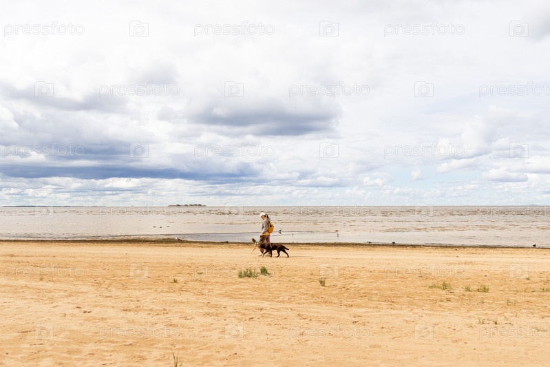 Профессиональный выгуливатель собак. мужчина гуляет с двумя домашними животными на пляже. собаки на поводке, женщина в шляпе