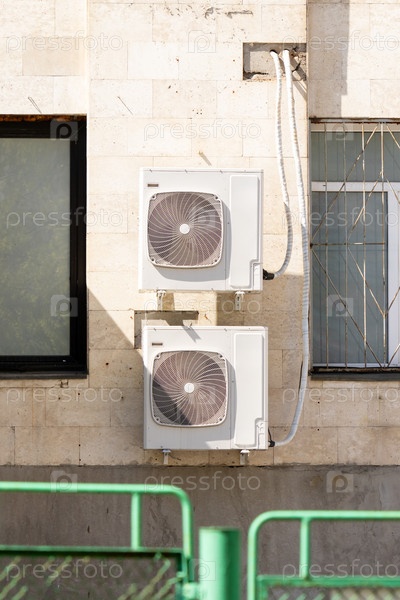 Кондиционеры установлены на стене. технология охлаждения воздуха в жаркую погоду