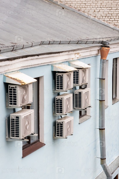 Кондиционеры установлены на стене здания. охлаждение в жаркую погоду