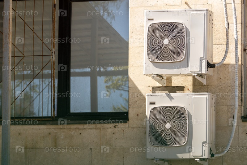 Кондиционеры установлены на стене. технология охлаждения воздуха в жаркую погоду