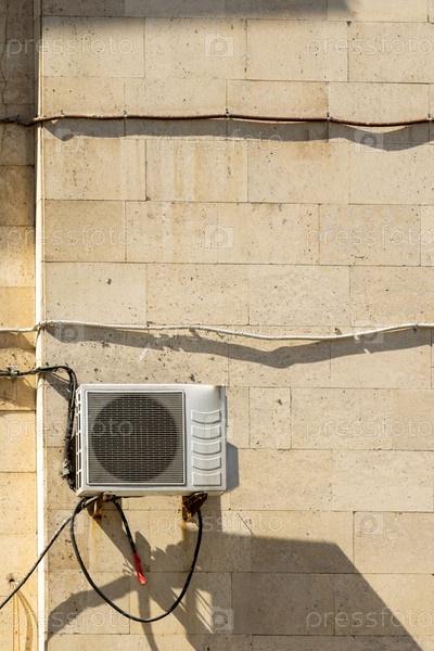 Кондиционер установлен на стене. технология охлаждения в жаркую погоду. температура воздуха