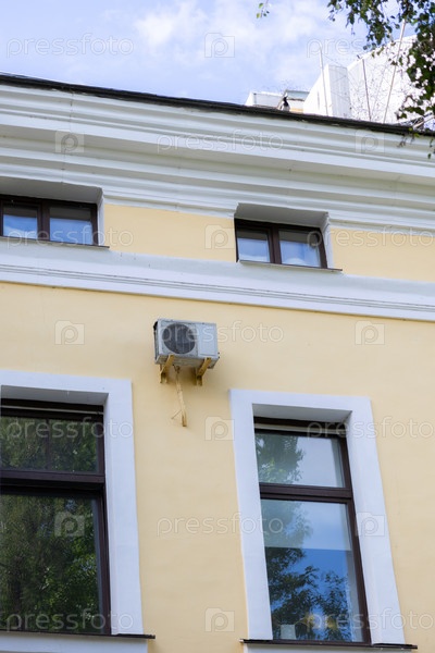 Кондиционер установлен на стене. технология охлаждения в жаркую погоду. температура воздуха