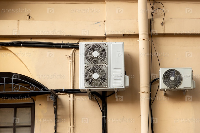 Кондиционер на фасаде желтого исторического дома.Вентиляция и система охлаждения