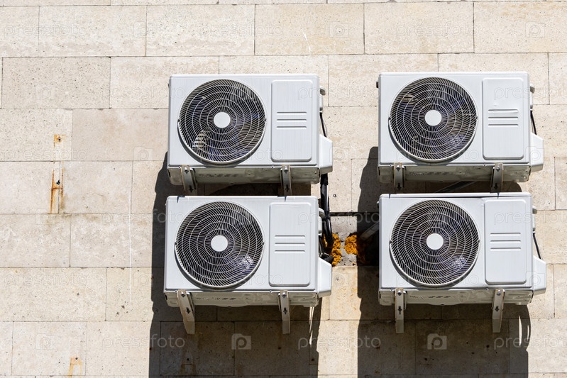 На стене четыре кондиционера.Кондиционеры белые