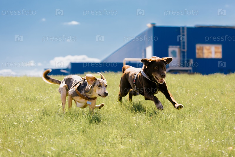 Две счастливые собаки бегут через поле на фоне голубого неба. пятнистый грейхаунд и лабрадорский ретривер