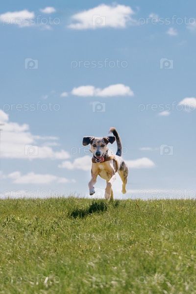 Веселая пятнистая собака бежит через поле среди голубого неба