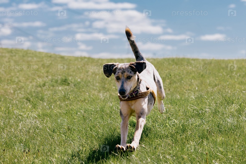 Веселая пятнистая собака бежит через поле среди голубого неба
