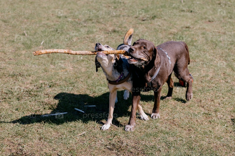Две забавные собаки играют в парке на зеленой лужайке