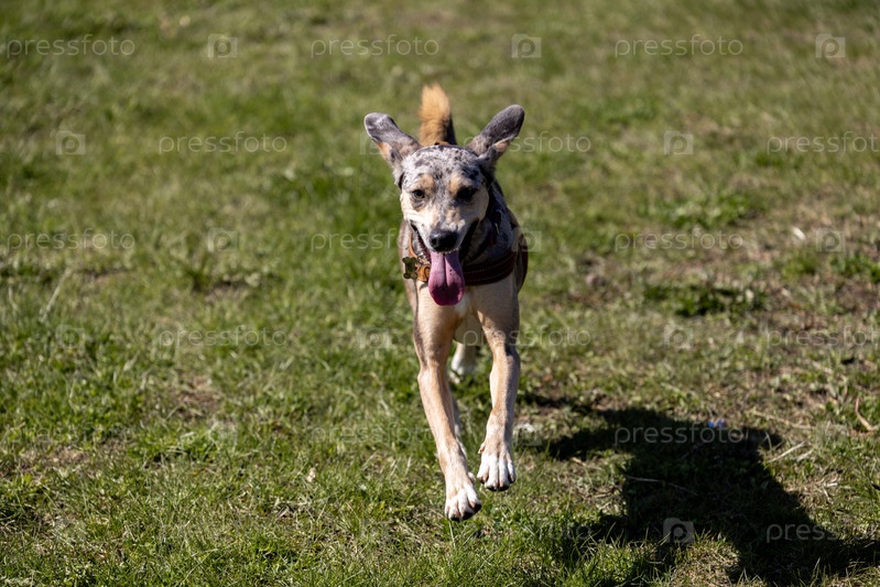 Веселая пятнистая собака бежит через поле среди голубого неба