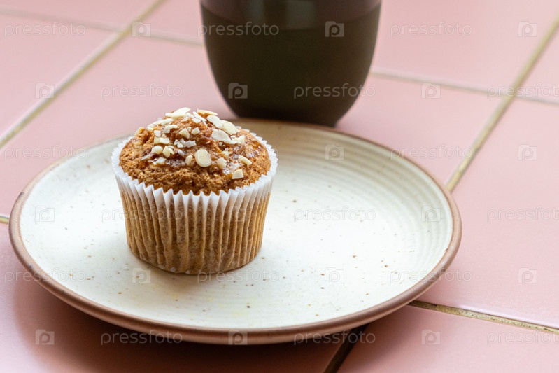 Чашка кофе и кексы сидят на белой тарелке на розовом плиточном столе