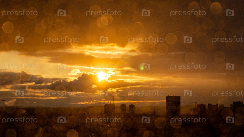 Боке от капель дождя на стекле, за которым виден силуэт города при закате