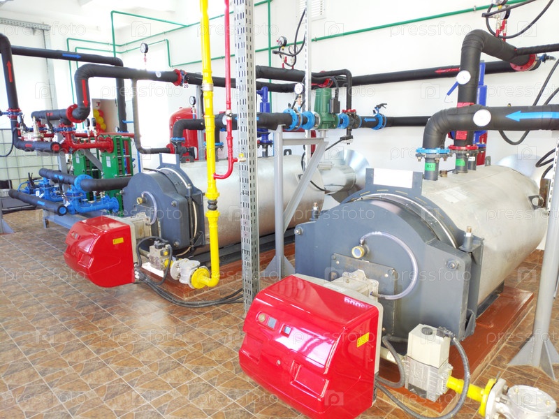 Современная котельня с двумя большими промышленными котлами. Котлы подключены к трубопроводам, обеспечивающим подачу воды и газа. Трубопроводы оснащены манометрами, запорными клапанами, насосами и арматурами