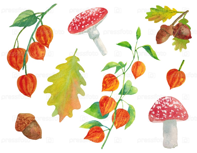 Акварельные рисунки. Set of cliparts with physalis, amanita, acorns and oak leaf, elements isolated on white background