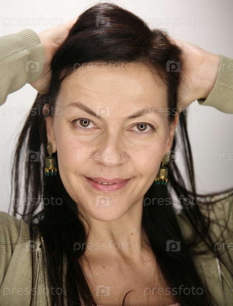 Милая улыбающаяся 52-летняя женщина с обнаженным макияжем и естественной стрижкой