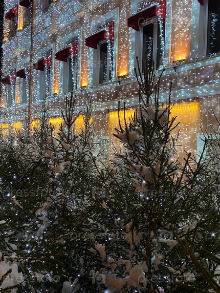 Дом, украшенный новогодней гирляндой рядом с рождественскими елками