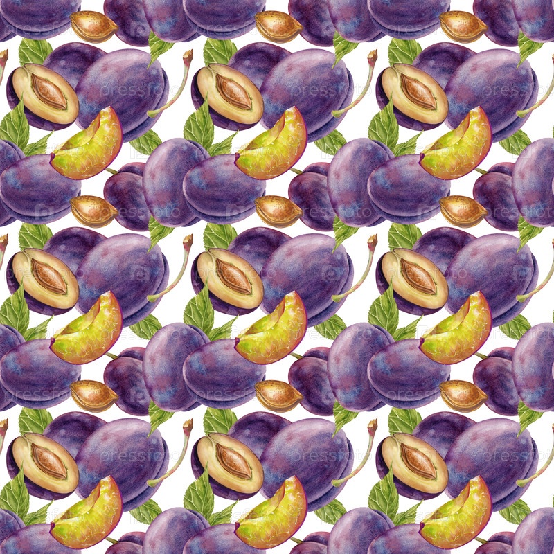 Акварельный бесшовный рисунок со сливами, ручной живописью. Ботанический фруктовый рисунок с целыми сливами, ломтиками, ямами и зелеными листьями на белом фоне. Для обоев, упаковки, текстиля и посуды