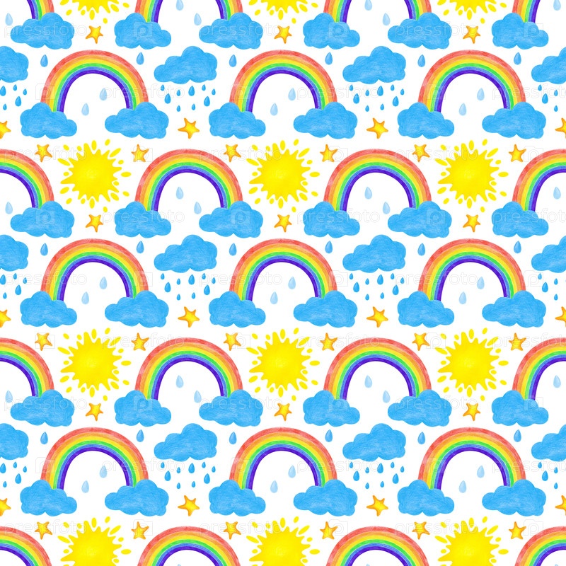 Бесшовный рисунок, нарисованный вручную, с красочными радугами, облаками, солнцем, звездами и дождем. Рисунок выполнен цветными карандашами на белом фоне. Красочный бесшовный шаблон обоев для детской комнаты, текстиля, упаковки