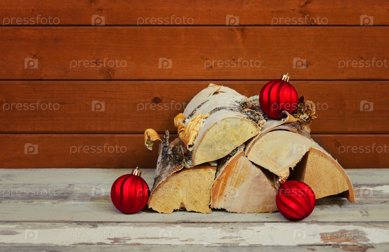 Рождественские шары и куча дров на старой деревянной поверхности