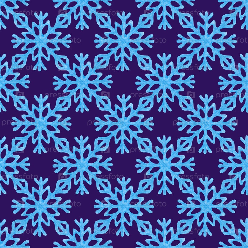 Бесшовный рисунок с синими снежинками на темно-синем фоне. Прекрасное изображение цветными карандашами. Рисование карандашом со снежинками для зимних тематик, праздничного декора, упаковки, обоев