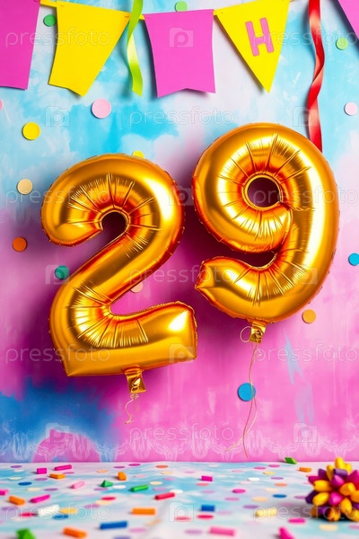 Двадцать девятиобразный шар, наполненный гелием, золотая буква 29, праздничный фон