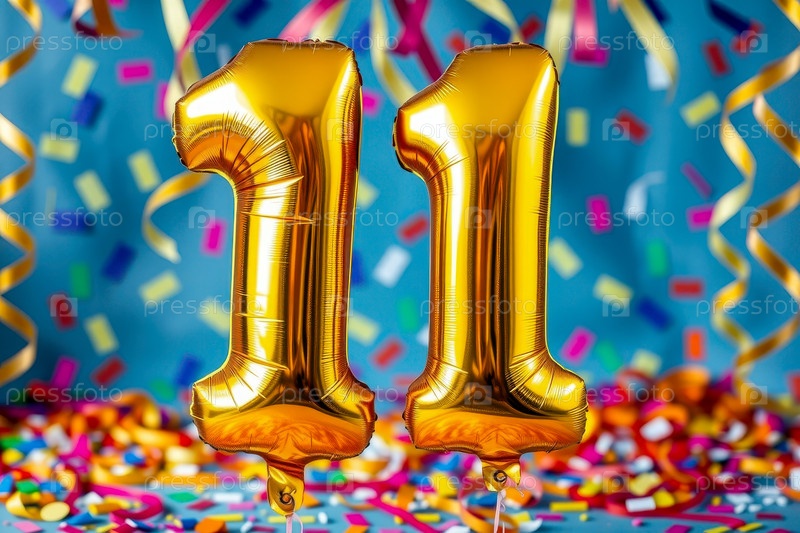 Балон, заполненный гелием, в форме числа одиннадцать, золотая буква 11 на праздничном фоне