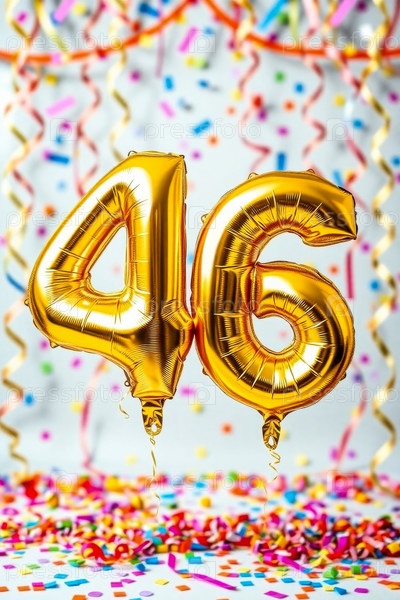 На праздничном фоне находится гелиевый воздушный шар в форме числа сорок шесть, золотой буквы 46