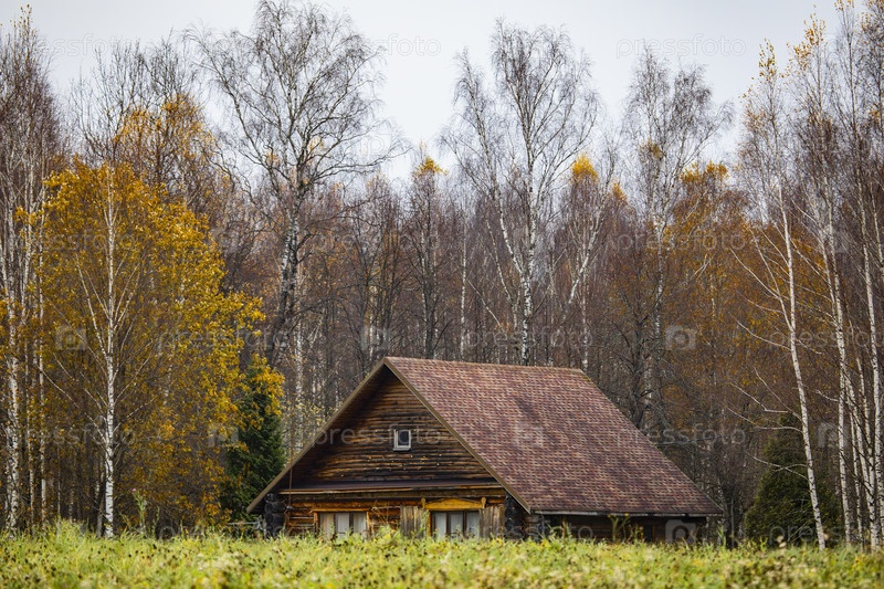 Деревянный дом на краю березового леса осенью