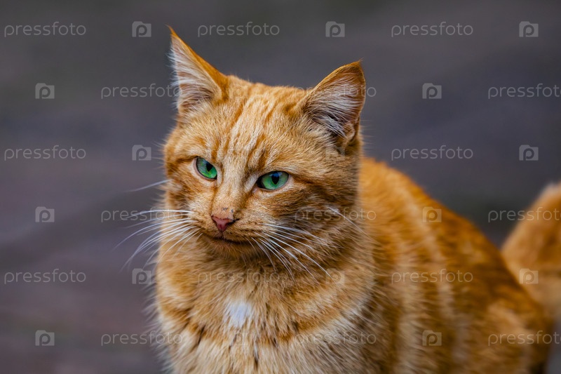 Красный кот с белой грудью на деревянном крыльце