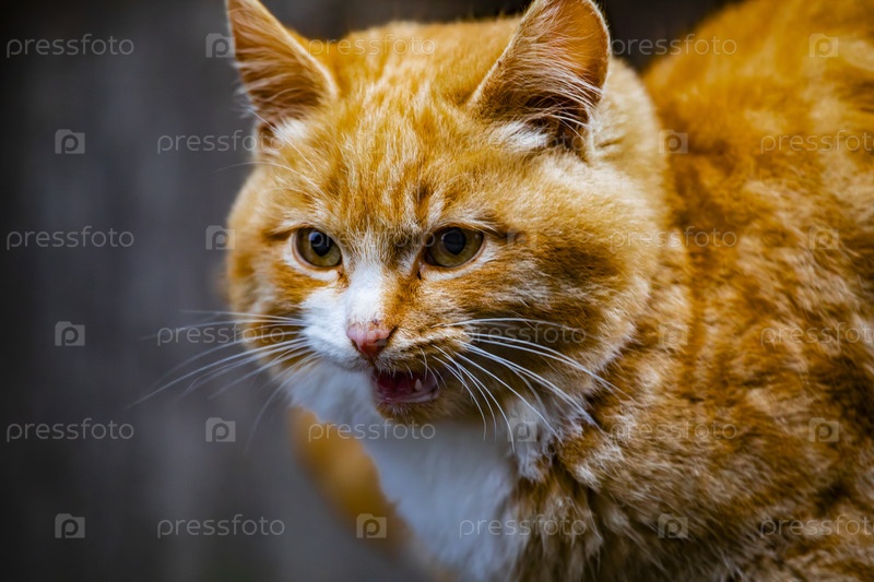 Красный кот с белой грудью на деревянном крыльце