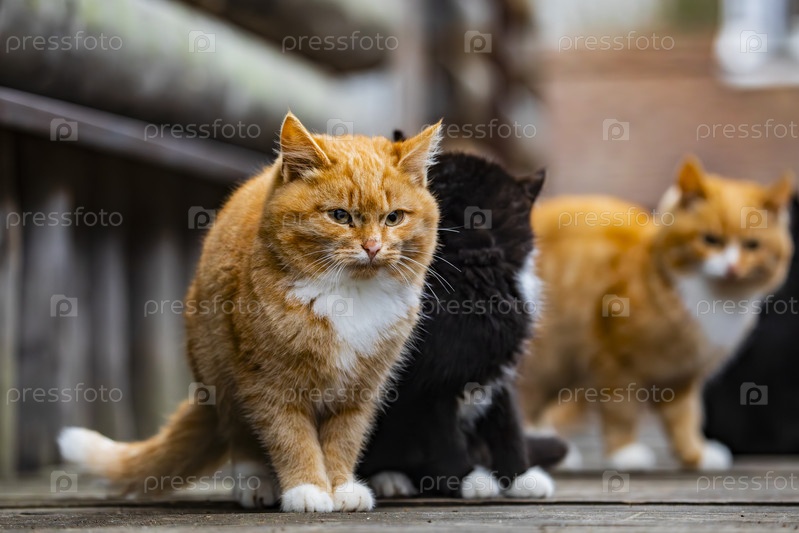Красный уличный кот с белым пятном на груди, на фоне других кошек