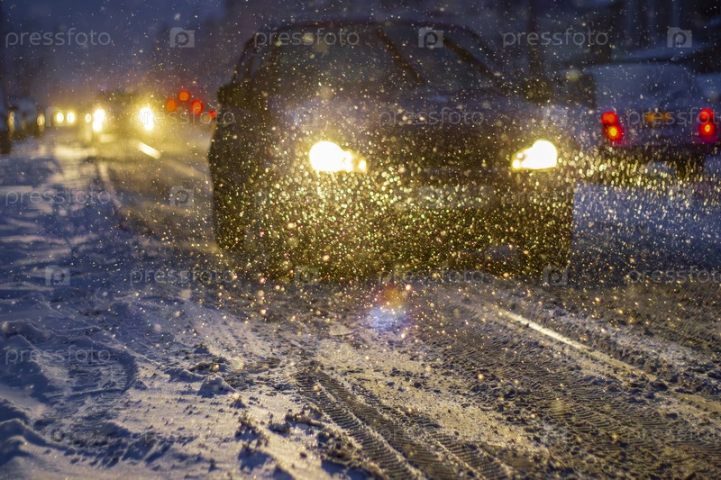 Снег на вечерней городской улице: свет фар и автомобиль