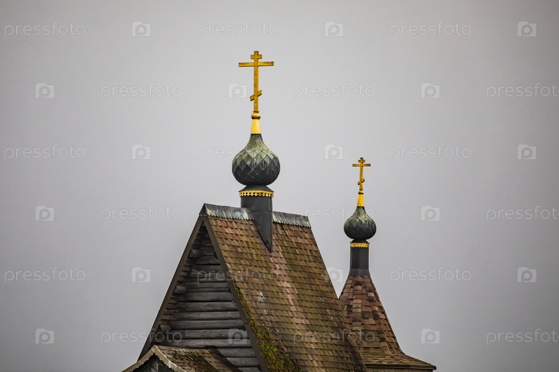Крыша деревянной православной церкви с луковичными куполами и крестами