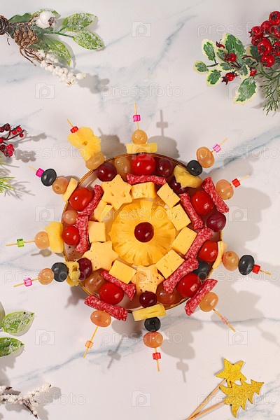 Канапе с помидорами, сыром моцареллой, салями, оливками и виноградом на мраморном столе в канун Рождества. рождественские и новогодние блюда, комплект закусок для праздничного стола