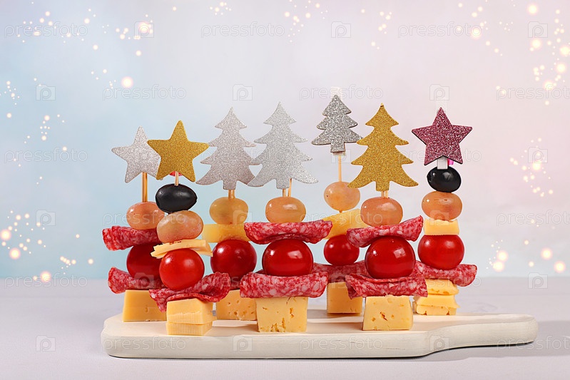 Канапе с помидорами, сыром моцареллой, салями, оливками и виноградом на мраморном столе в канун Рождества. рождественские и новогодние блюда, комплект закусок для праздничного стола