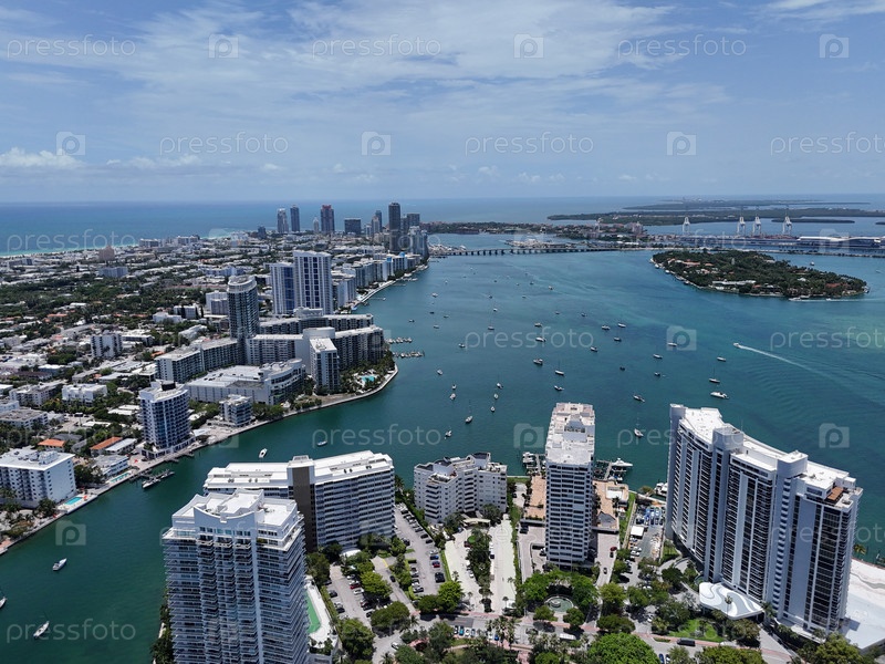 Вид с воздуха на панораму Майами и прибрежные острова над Бискейнским заливом в солнечной Флориде, США