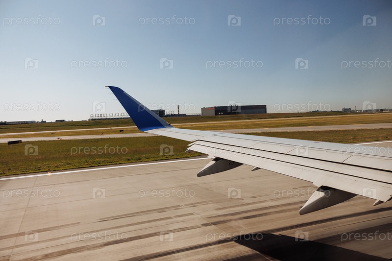 Вид с крыла самолета во время движения по взлетно-посадочной полосе аэропорта под чистым голубым небом в солнечный день