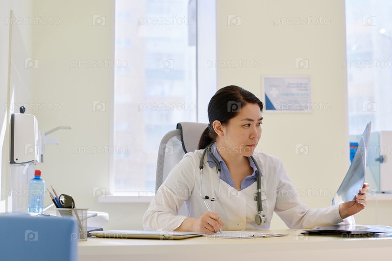 Азиатская женщина-врач, изучающая рентгеновское изображение в медицинском кабинете