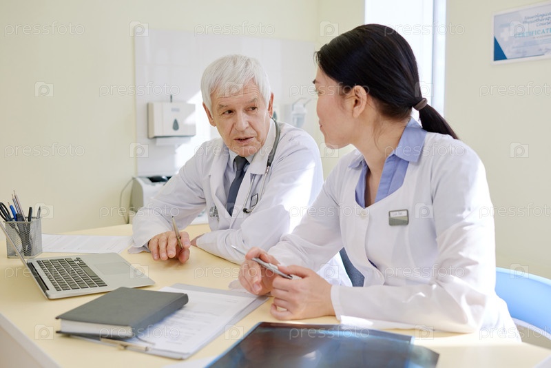 Мужчина Старший Доктор Консультации Молодая азиатская женщина Врач в больнице