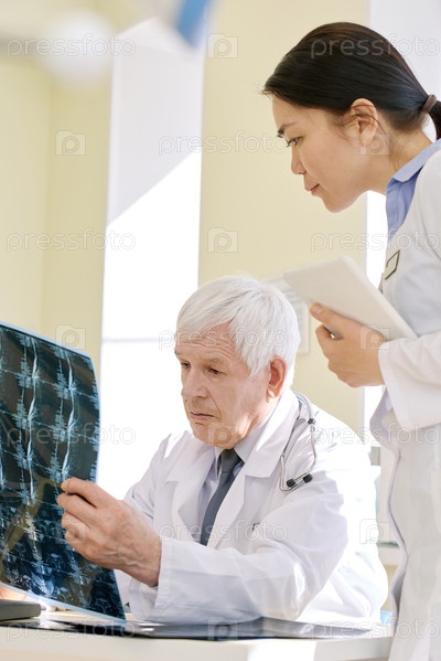 Старший мужской врач осматривает рентгеновские лучи, в то время как молодая азиатская коллега-женщина наблюдает