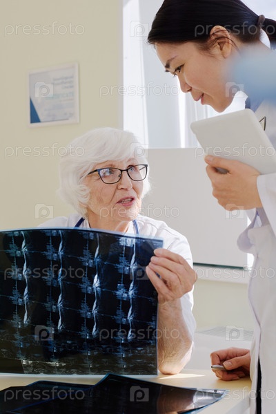 Женщина обсуждает результаты рентгеновских лучей с молодой старшей азиатской женщиной-врачом