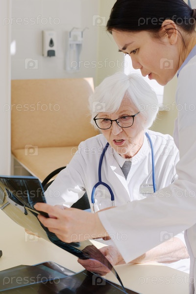 Старшая женщина-врач обсуждает результаты рентгеновских лучей с молодой азиатской женщиной
