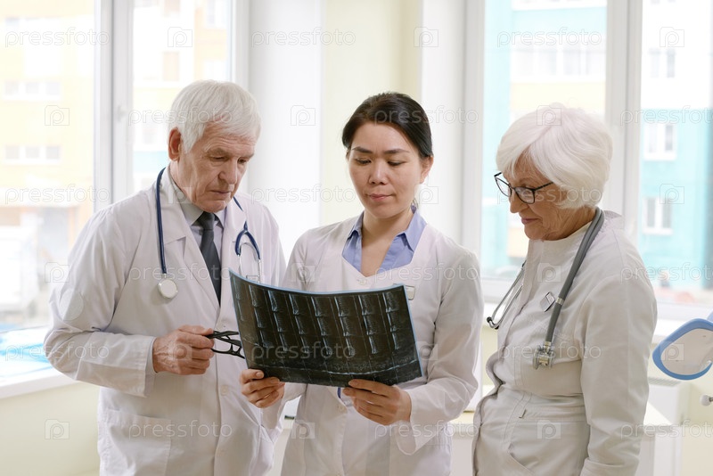 Команда врачей, анализирующих рентгеновское изображение вместе