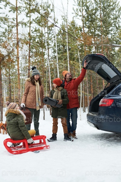 Семья готовится к зимней активности на открытом воздухе в снежном лесу